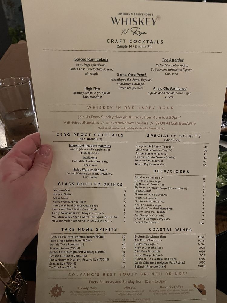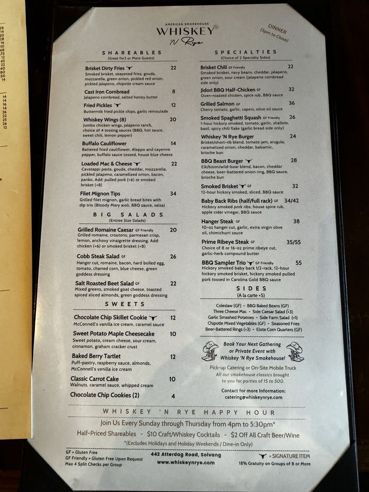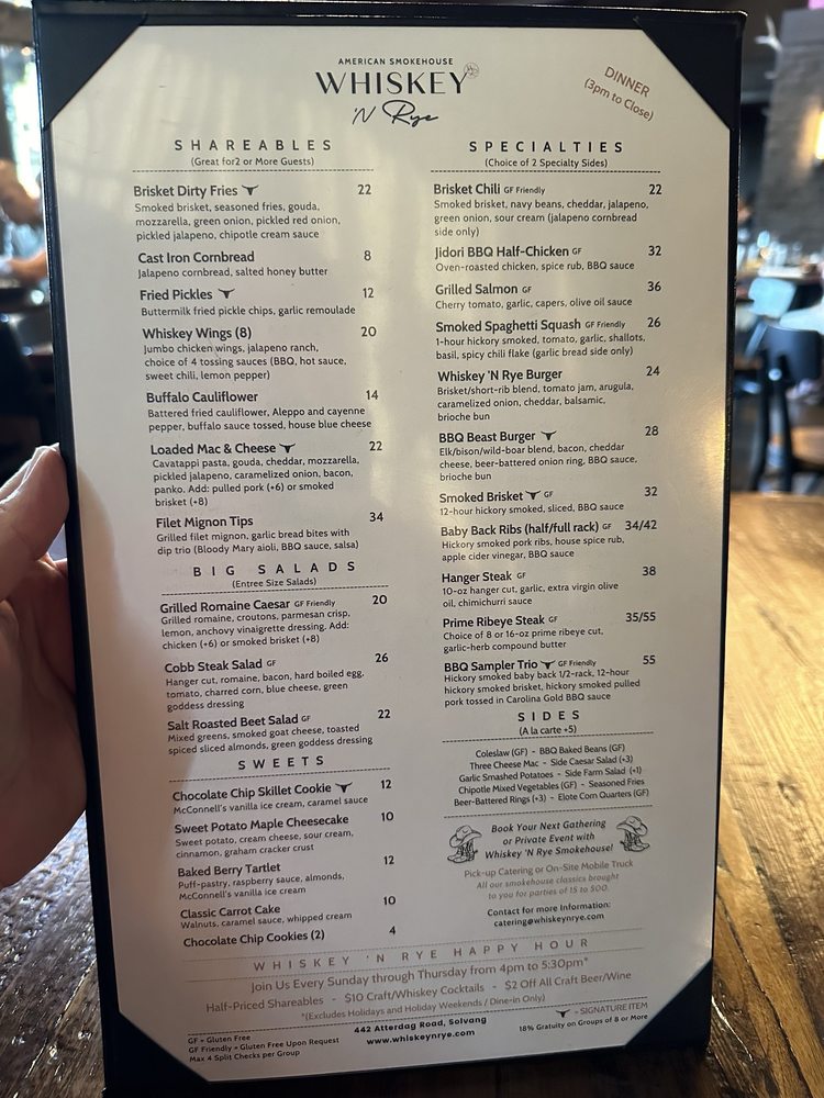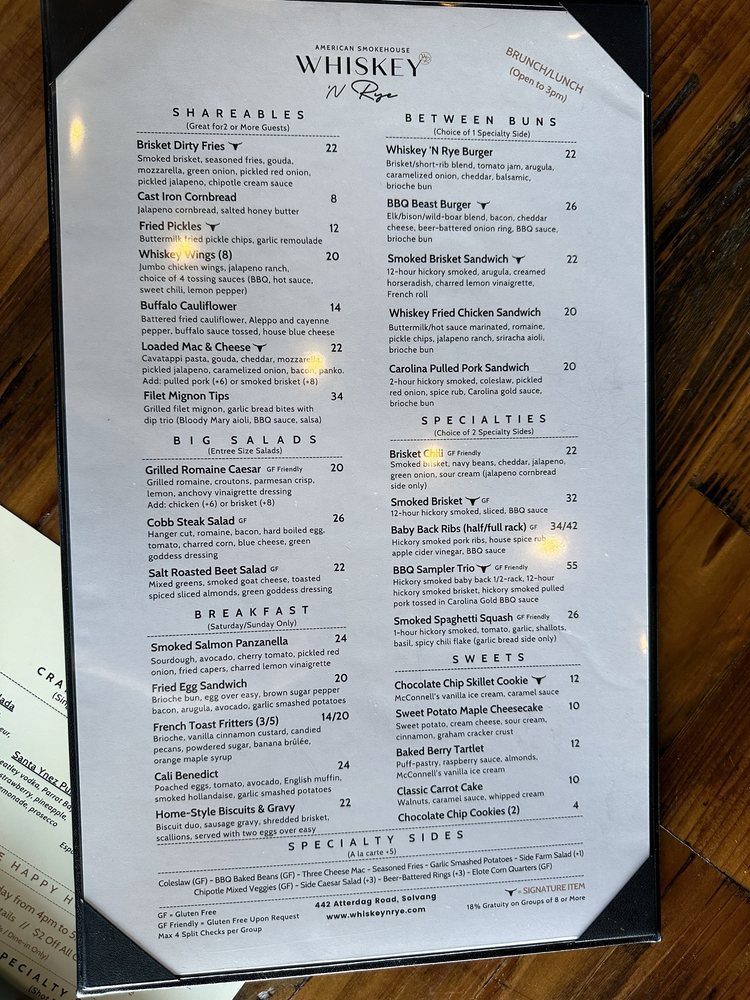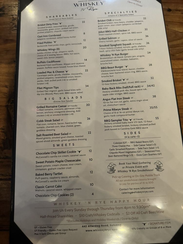 Introducing the menu at Whiskey 'N Rye, a delightful combination of desserts and barbecue in Solvang, CA. This trendy and romantic spot offers a range of options, including pescatarian dishes and vegan choices like smoked spaghetti squash. The unique flavors and quality of dishes, such as the brisket mac n cheese and BBQ sampler trio, have left customers raving. The ambiance, with its earthy charm and outdoor seating, adds to the overall dining experience. The attentive service and welcoming staff make every visit a memorable one. With options for happy hour specials and shareable desserts like the cookie skillet, Whiskey 'N Rye is a must-visit for food enthusiasts looking for a cozy yet upscale dining experience.