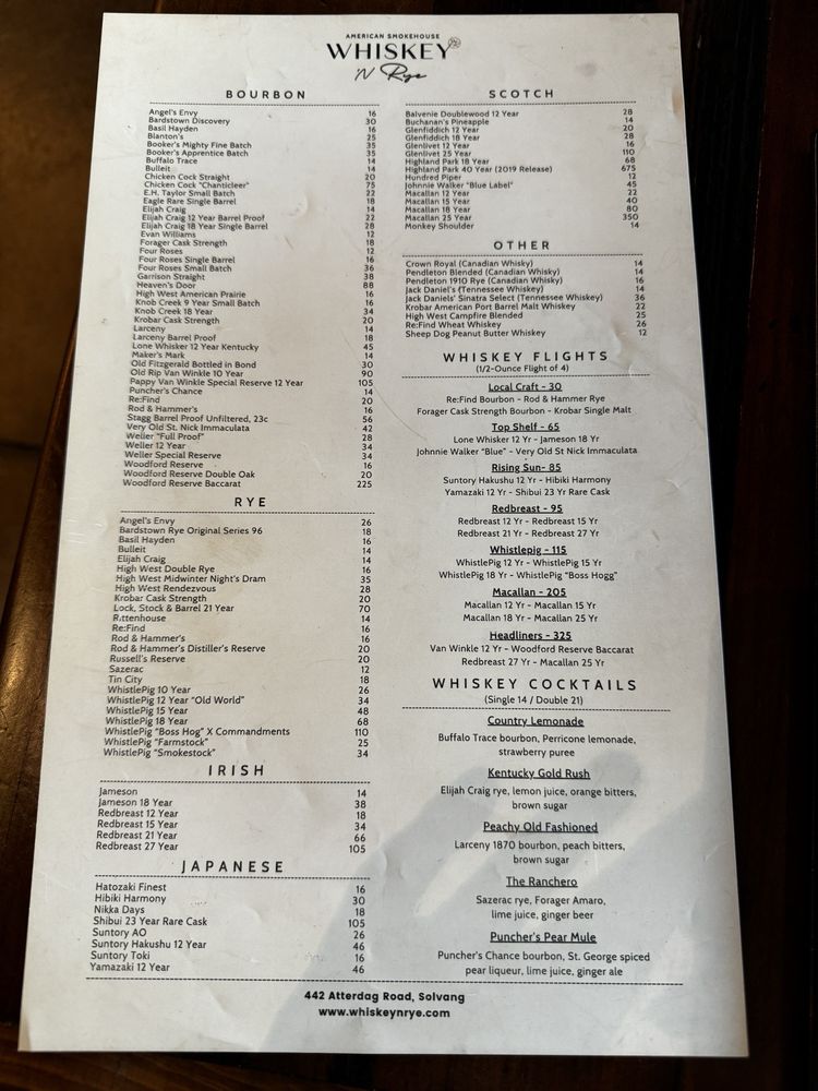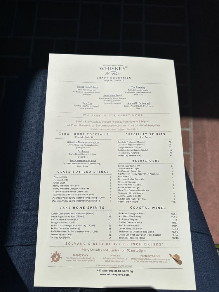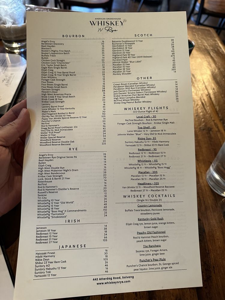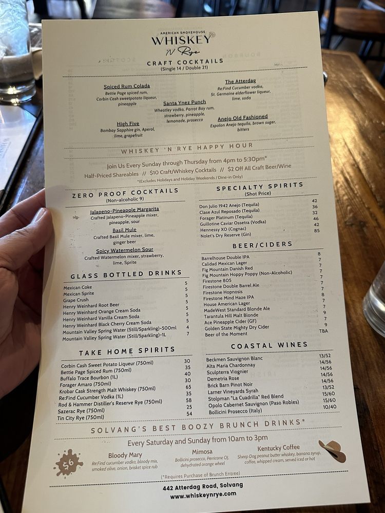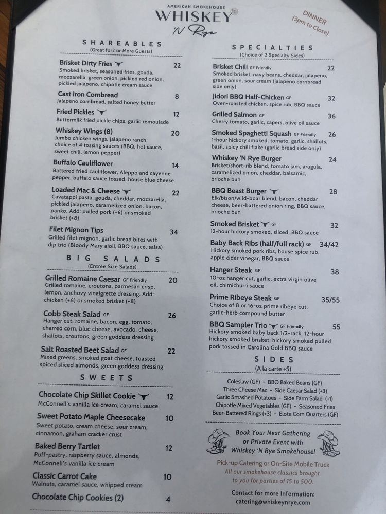 Introducing the menu at Whiskey 'N Rye, a delightful combination of desserts and barbecue in Solvang, CA. This trendy and romantic spot offers a range of options, including pescatarian dishes and vegan choices like smoked spaghetti squash. The unique flavors and quality of dishes, such as the brisket mac n cheese and BBQ sampler trio, have left customers raving. The ambiance, with its earthy charm and outdoor seating, adds to the overall dining experience. The attentive service and welcoming staff make every visit a memorable one. With options for happy hour specials and shareable desserts like the cookie skillet, Whiskey 'N Rye is a must-visit for food enthusiasts looking for a cozy yet upscale dining experience.